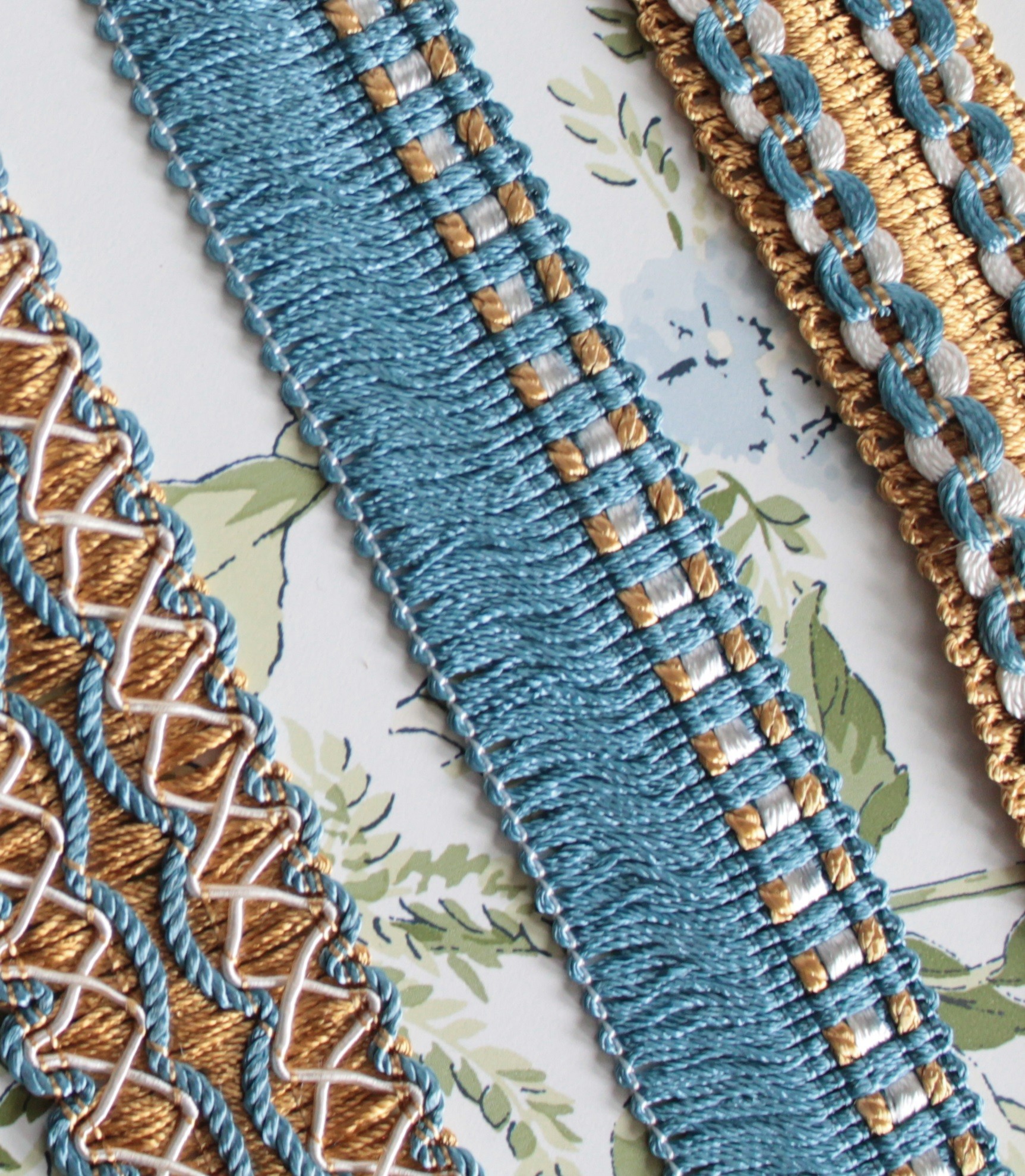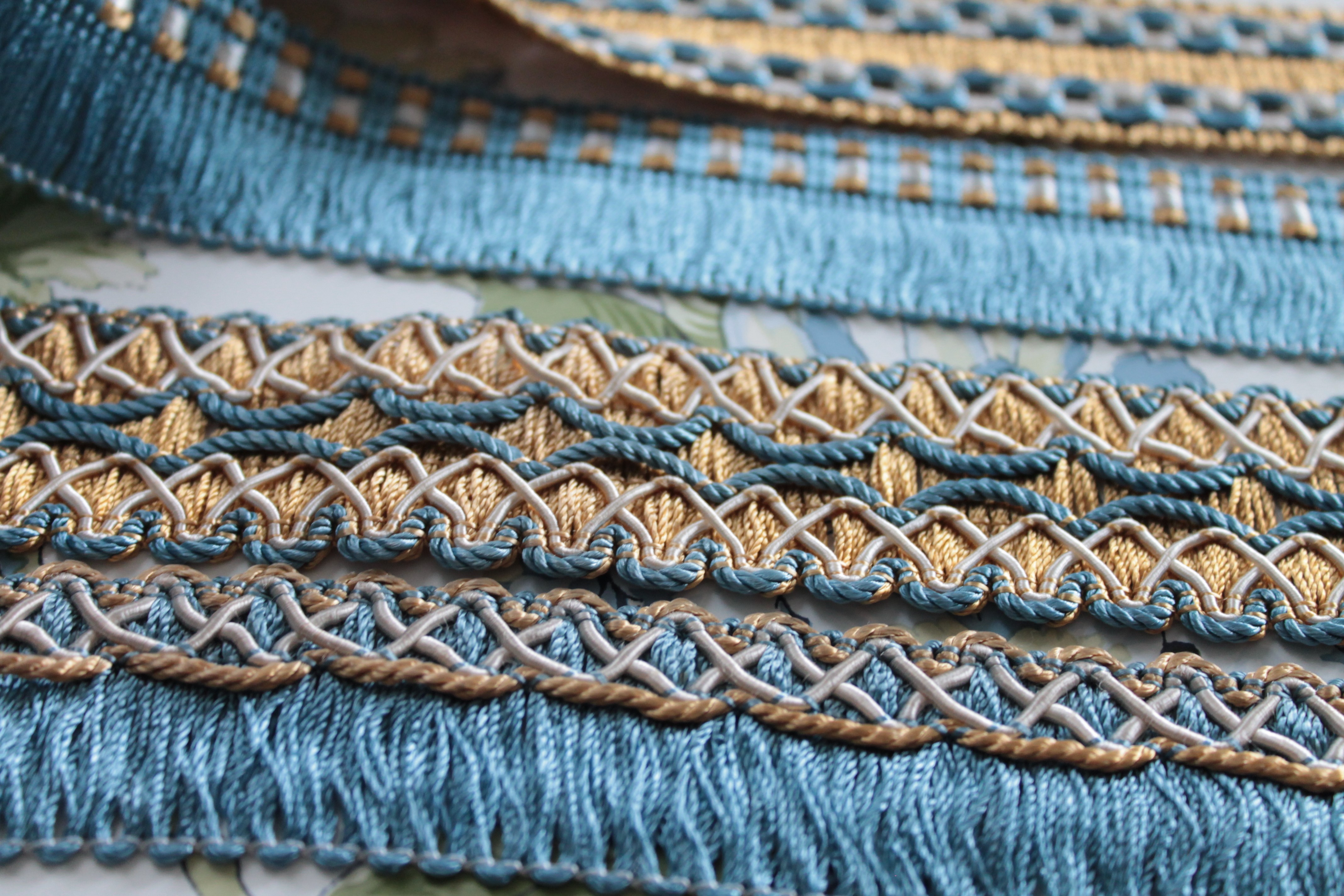 A/ Galon à franges bleues (bordure à entrelacs jaune or et ivoire) : Largeur : 3.4 cm - 1.34" - En tirant sur le fil, vous dégagerez les franges.