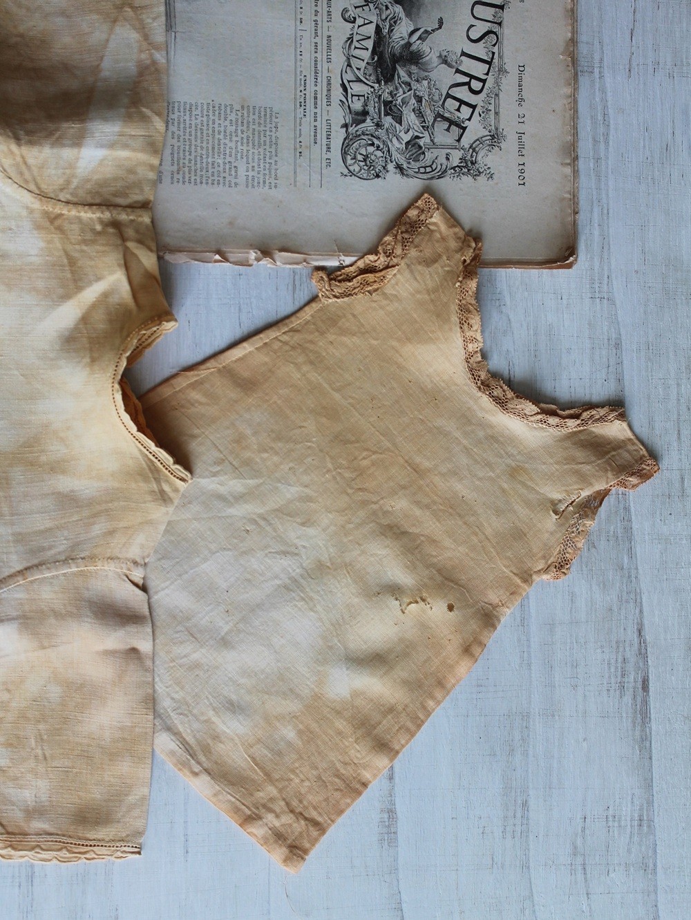 Teinture végétale réalisée par mes soins : la petite robe n'est pas destinée à être portée, elle sera un beau support à broder.