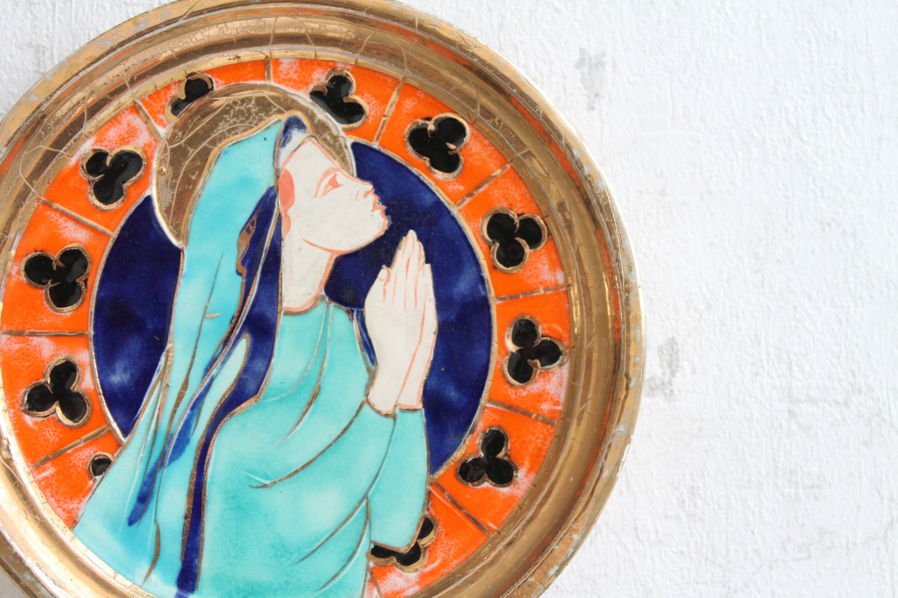 Ce tableau de prière à suspendre rond est une pièce décorative religieuse vintage des années 1920, émaillée et prête à être accrochée au mur.