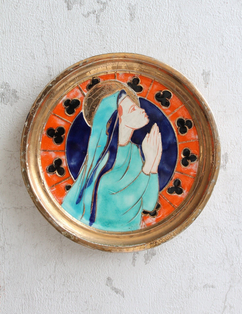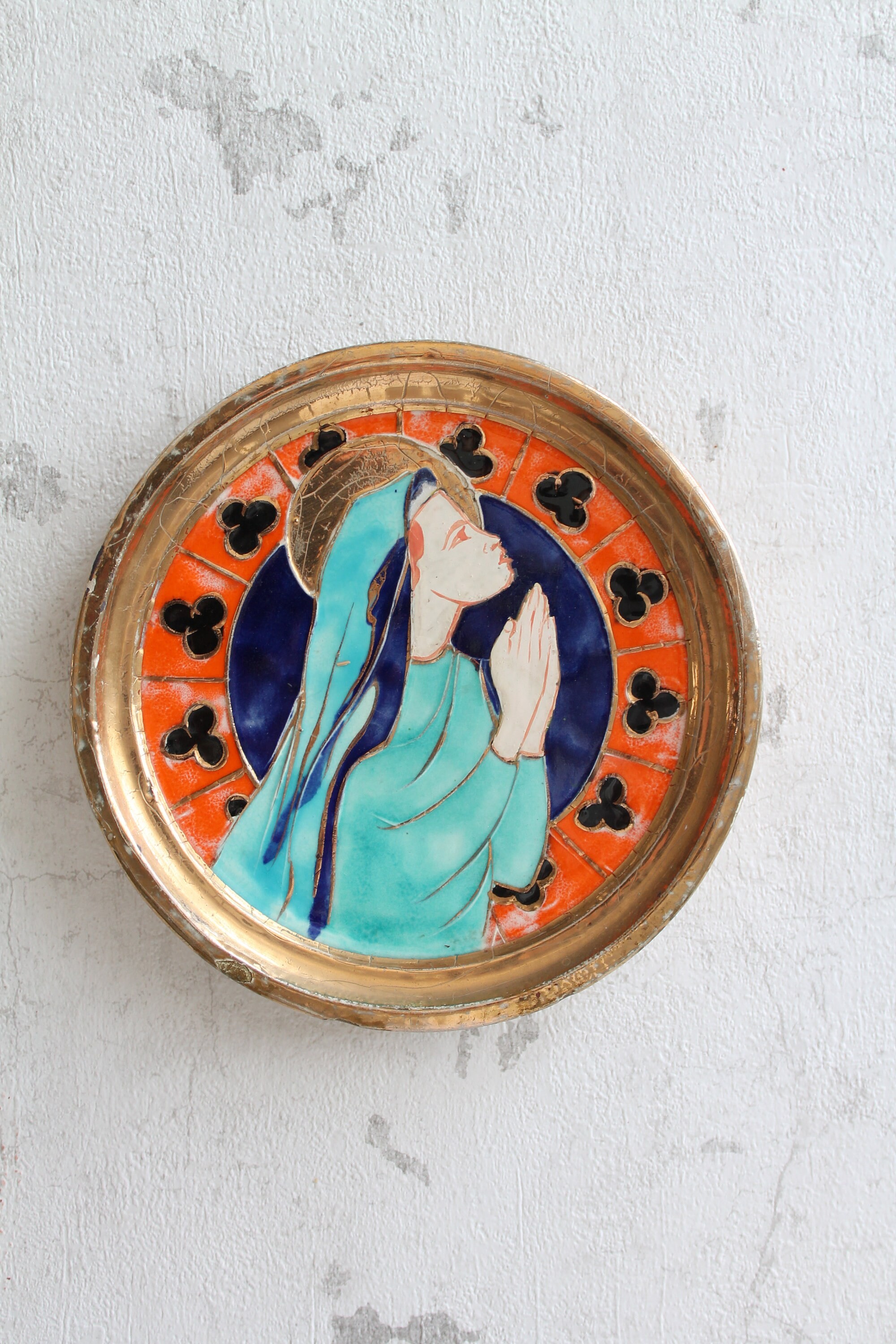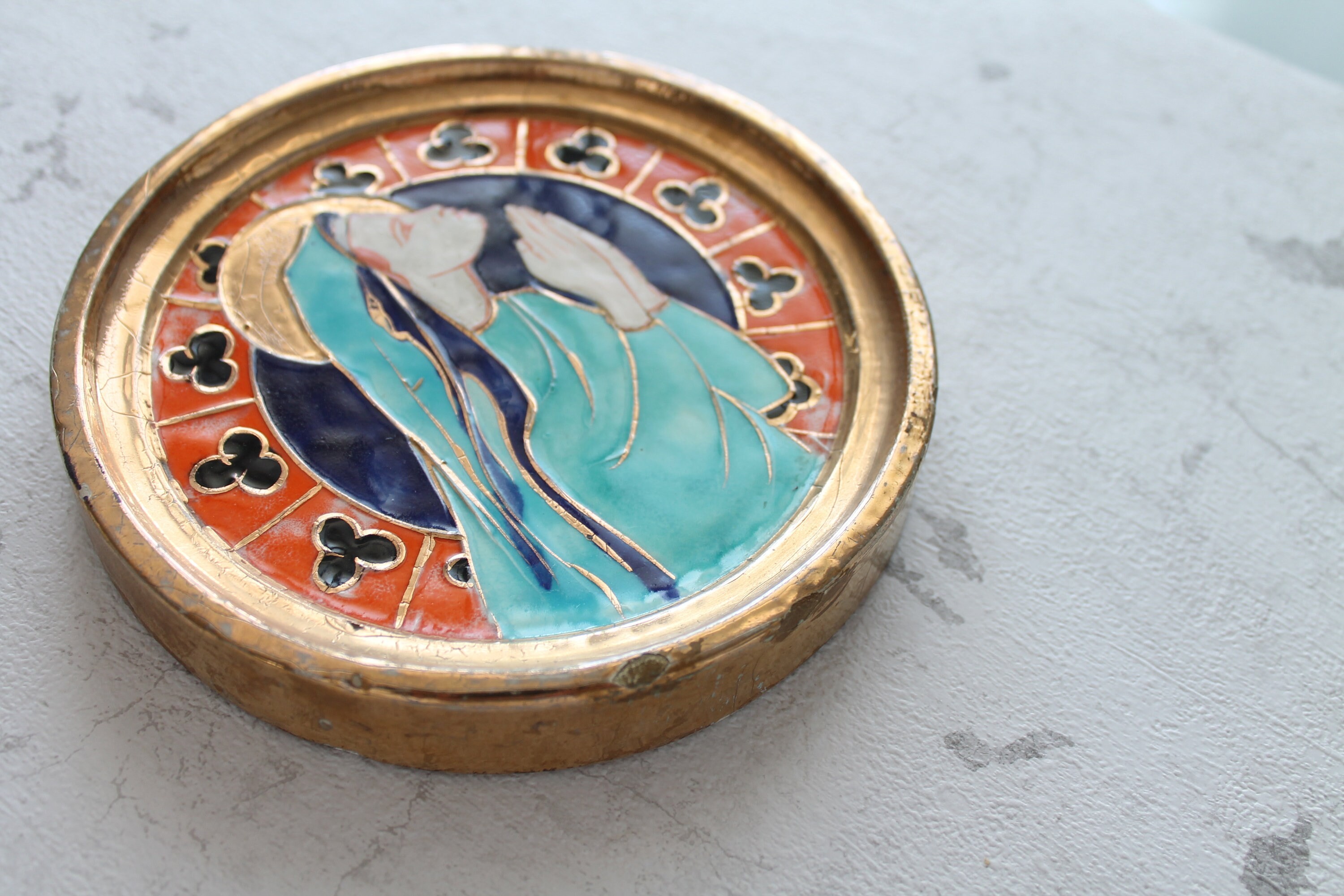 🕊 Petit cadre religieux rond à suspendre – Décoration murale émaillée – Vintage 1920