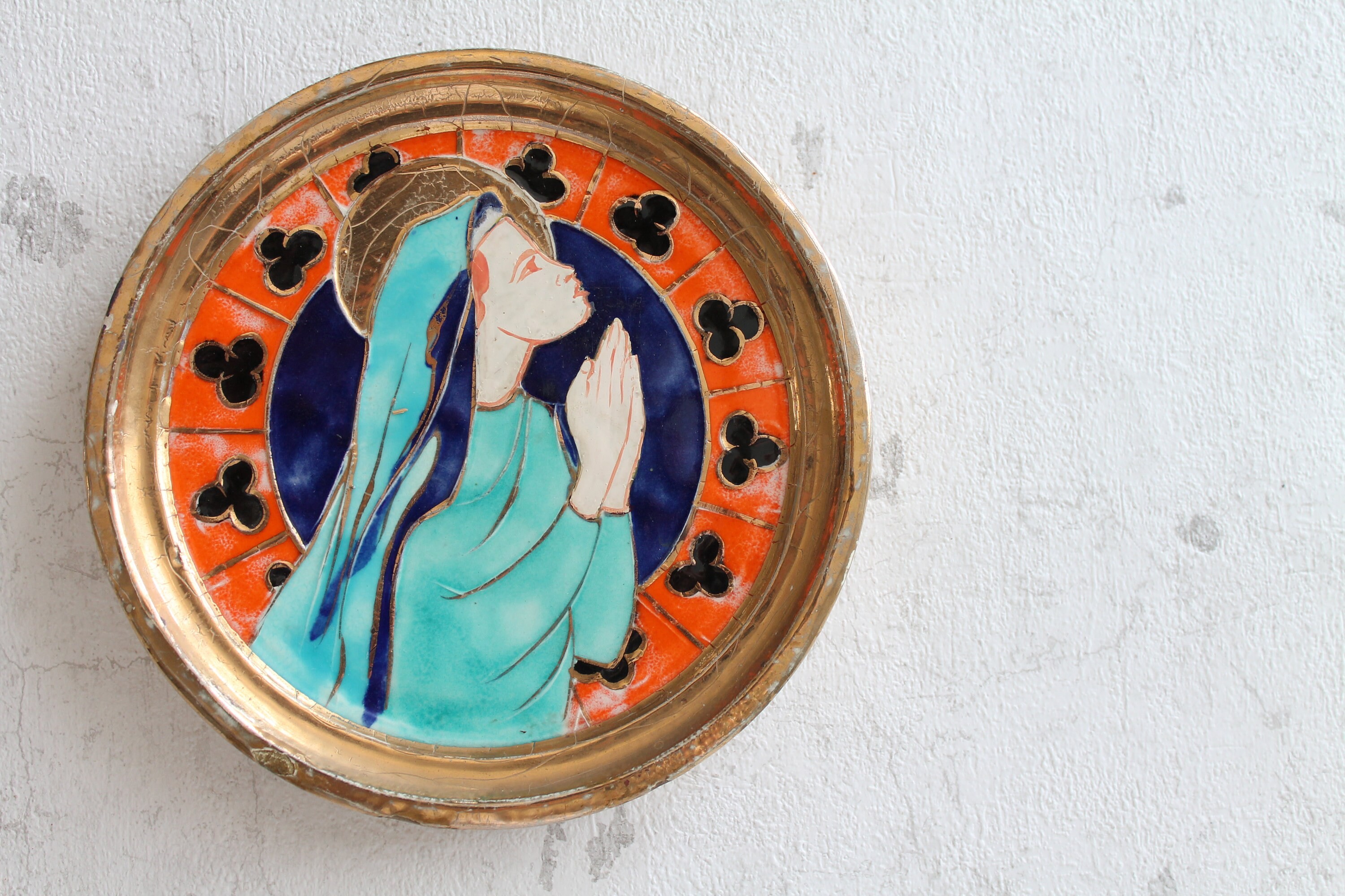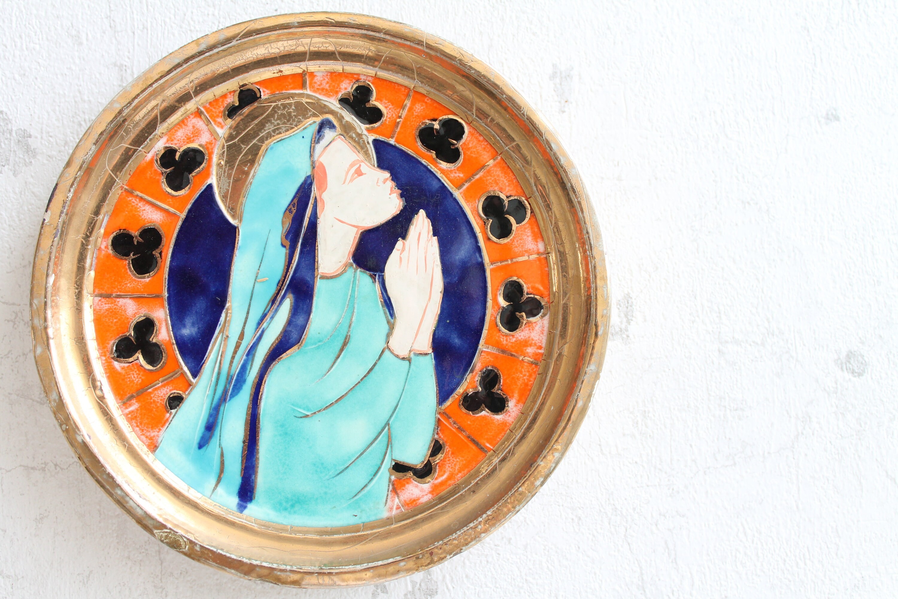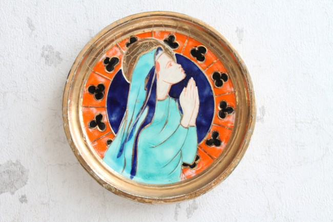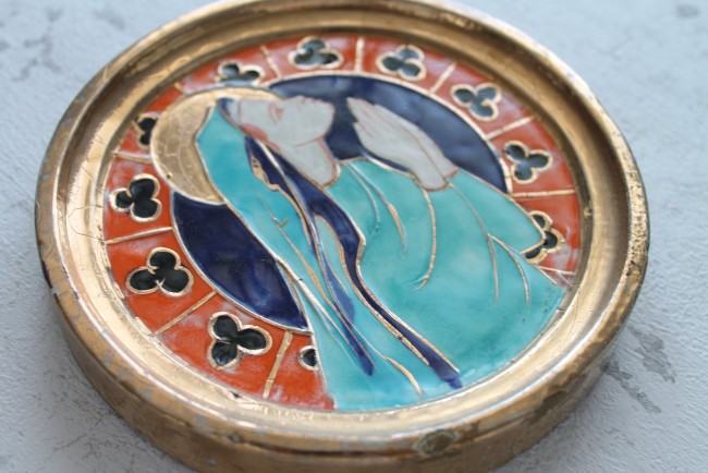 🕊 Petit cadre religieux rond à suspendre – Décoration murale émaillée – Vintage 1920