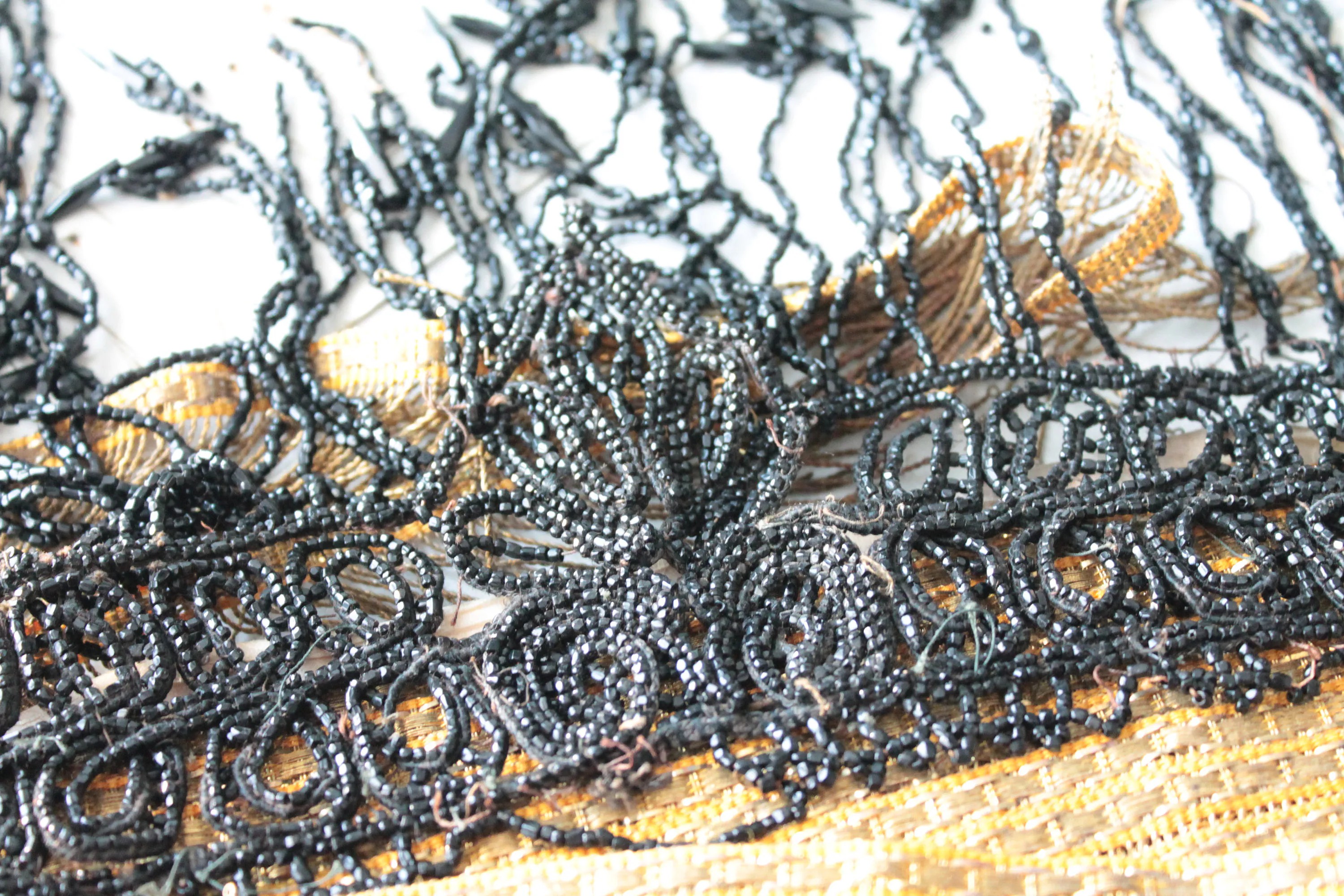 L’ensemble est composé de centaines de perles de jais, minutieusement brodées à la main. Cette broderie a très probablement nécessité plusieurs dizaines d’heures de travail artisanal, témoignant d’un savoir-faire aujourd’hui disparu.