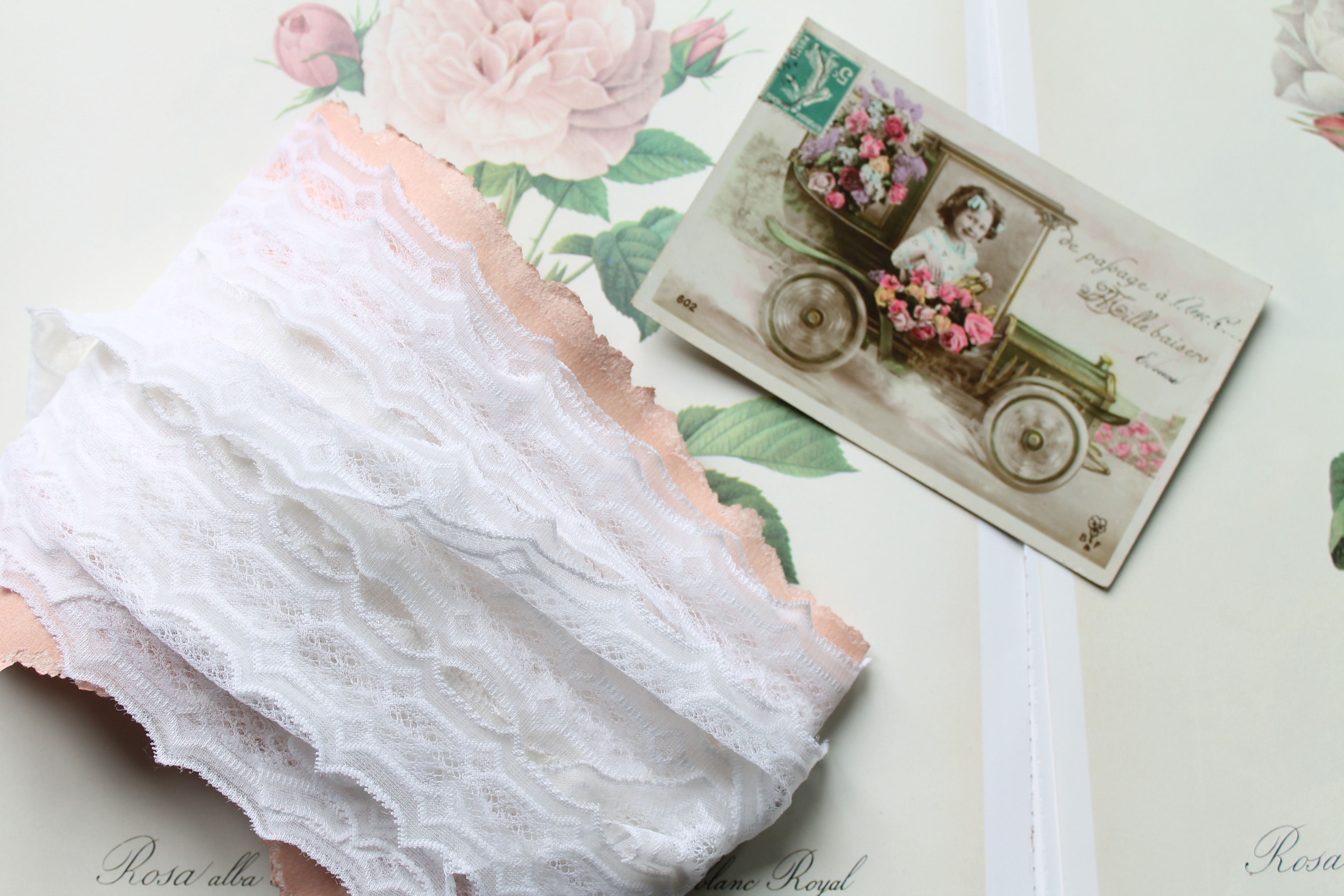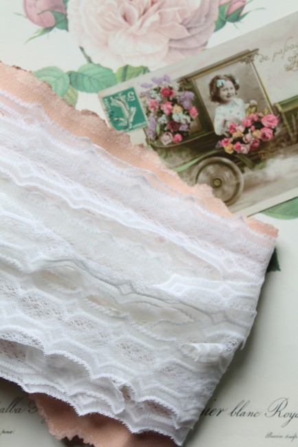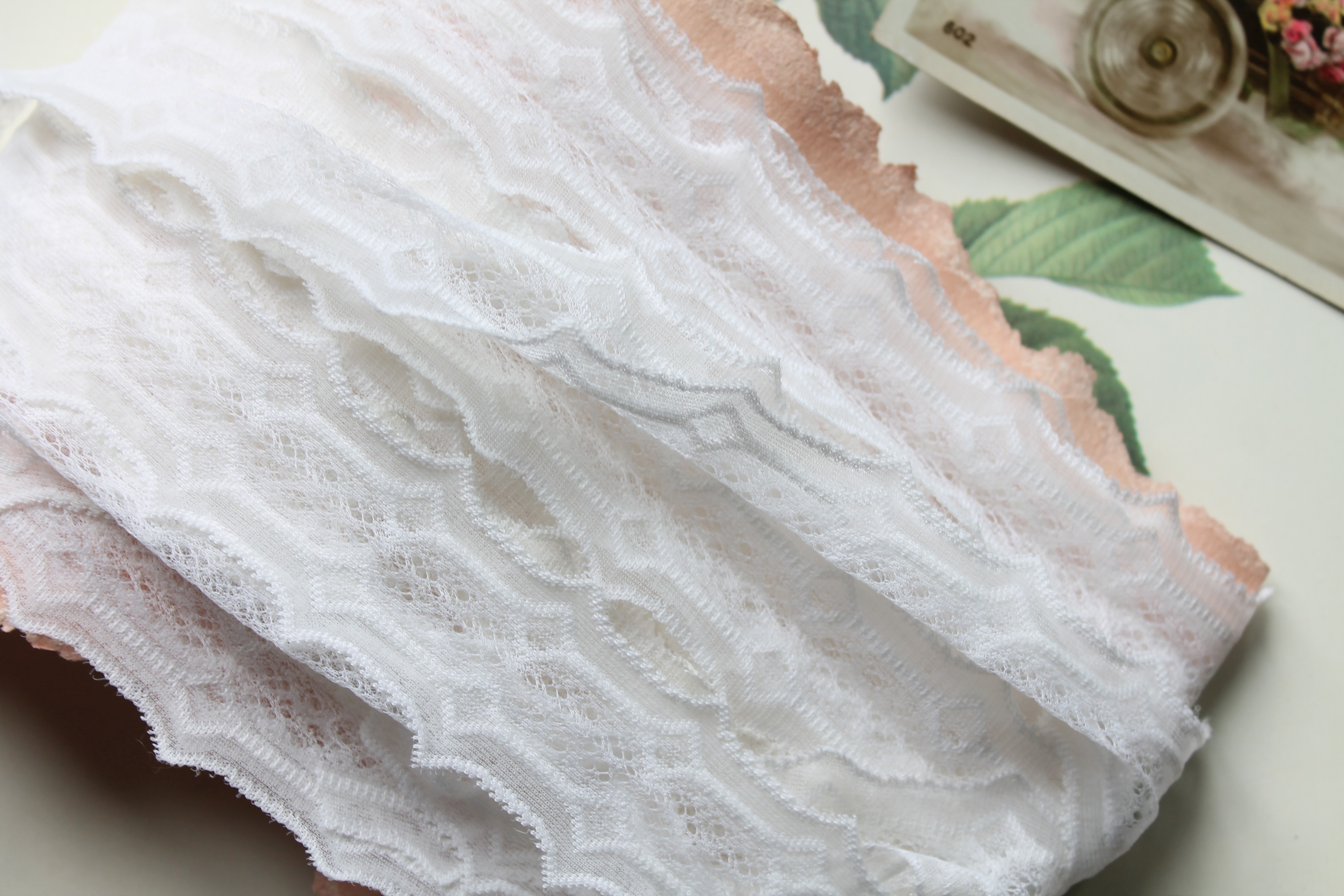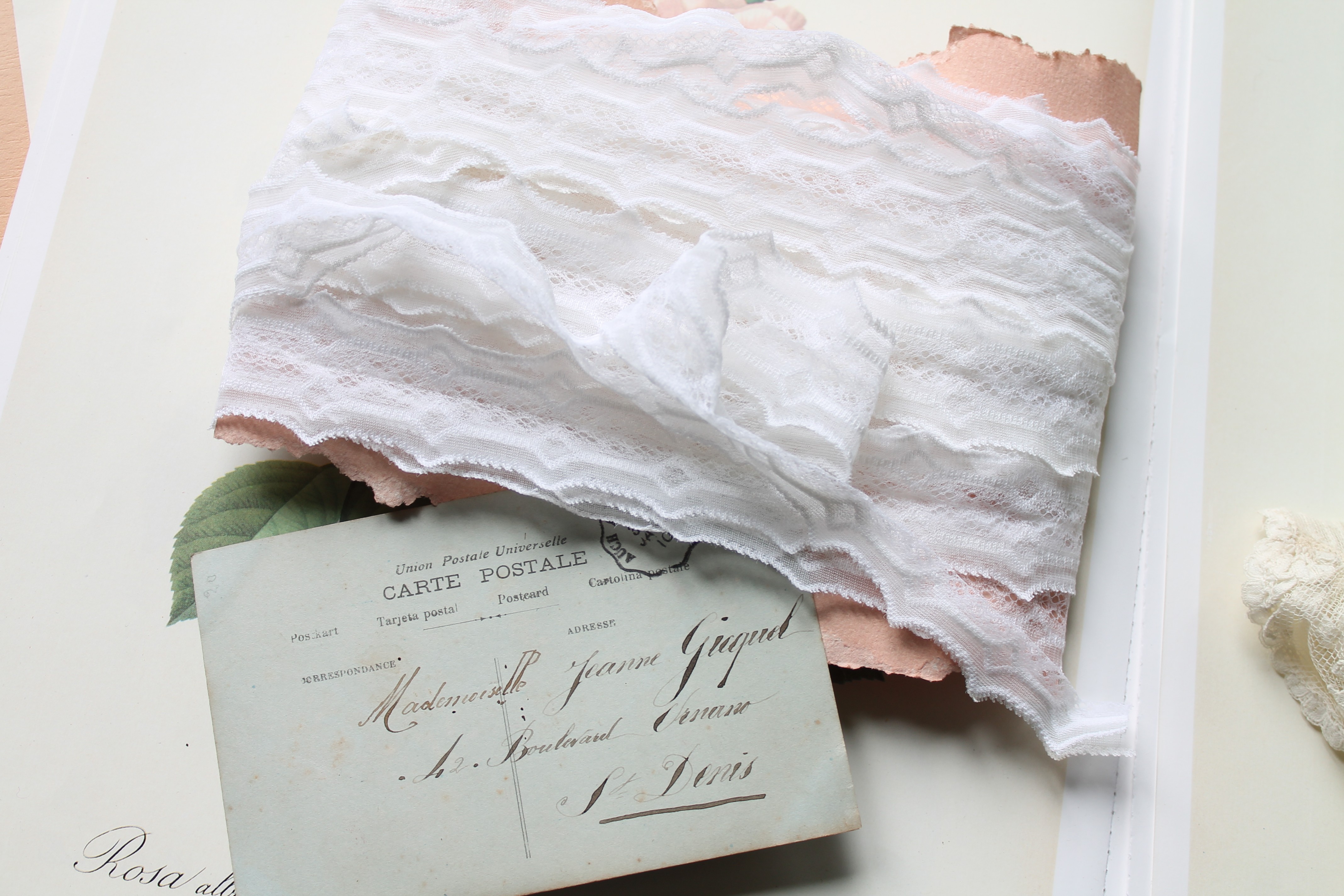 Cette dentelle française rétro blanche en nylon, d'une largeur de 4 cm et d'une longueur totale de 9 mètres répartie en trois morceaux, est un véritable témoignage du savoir-faire textile.