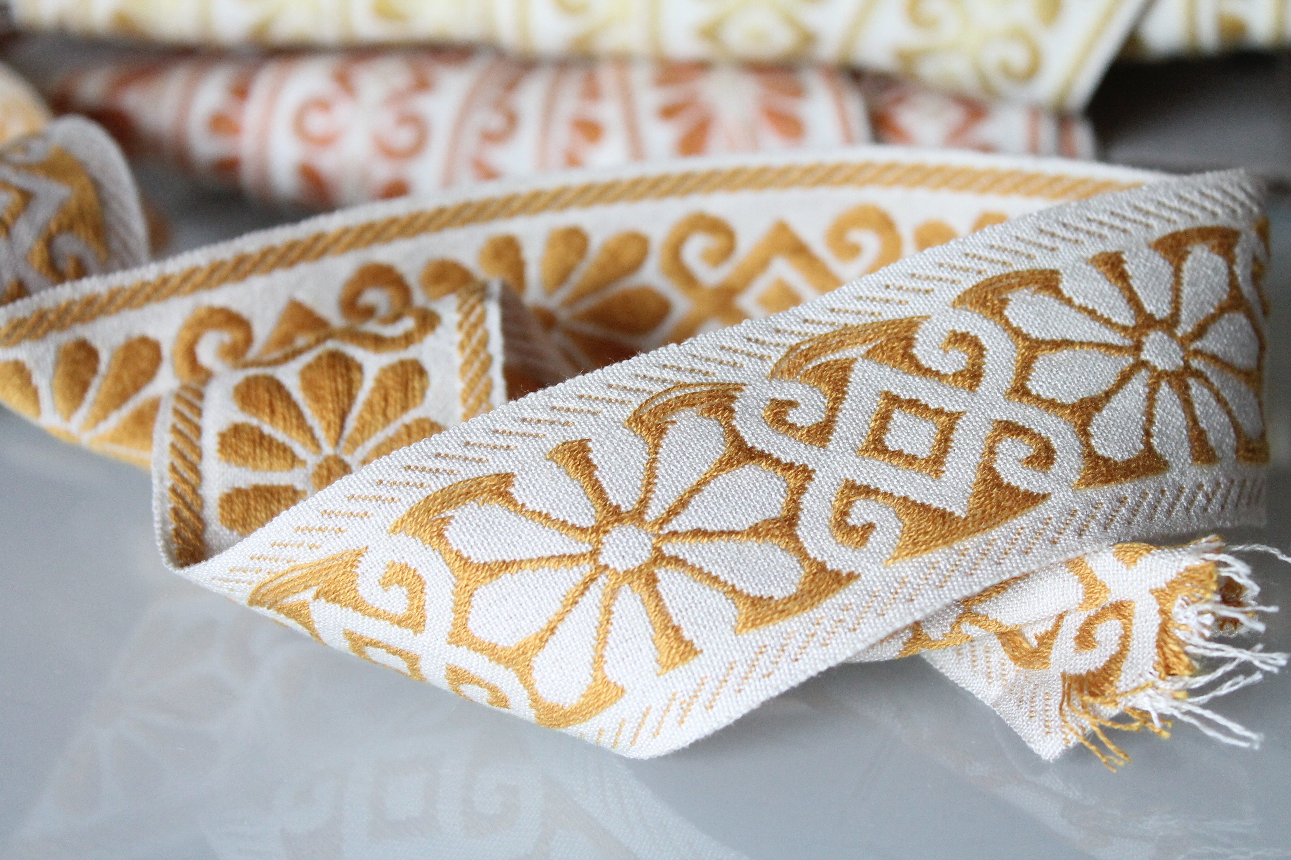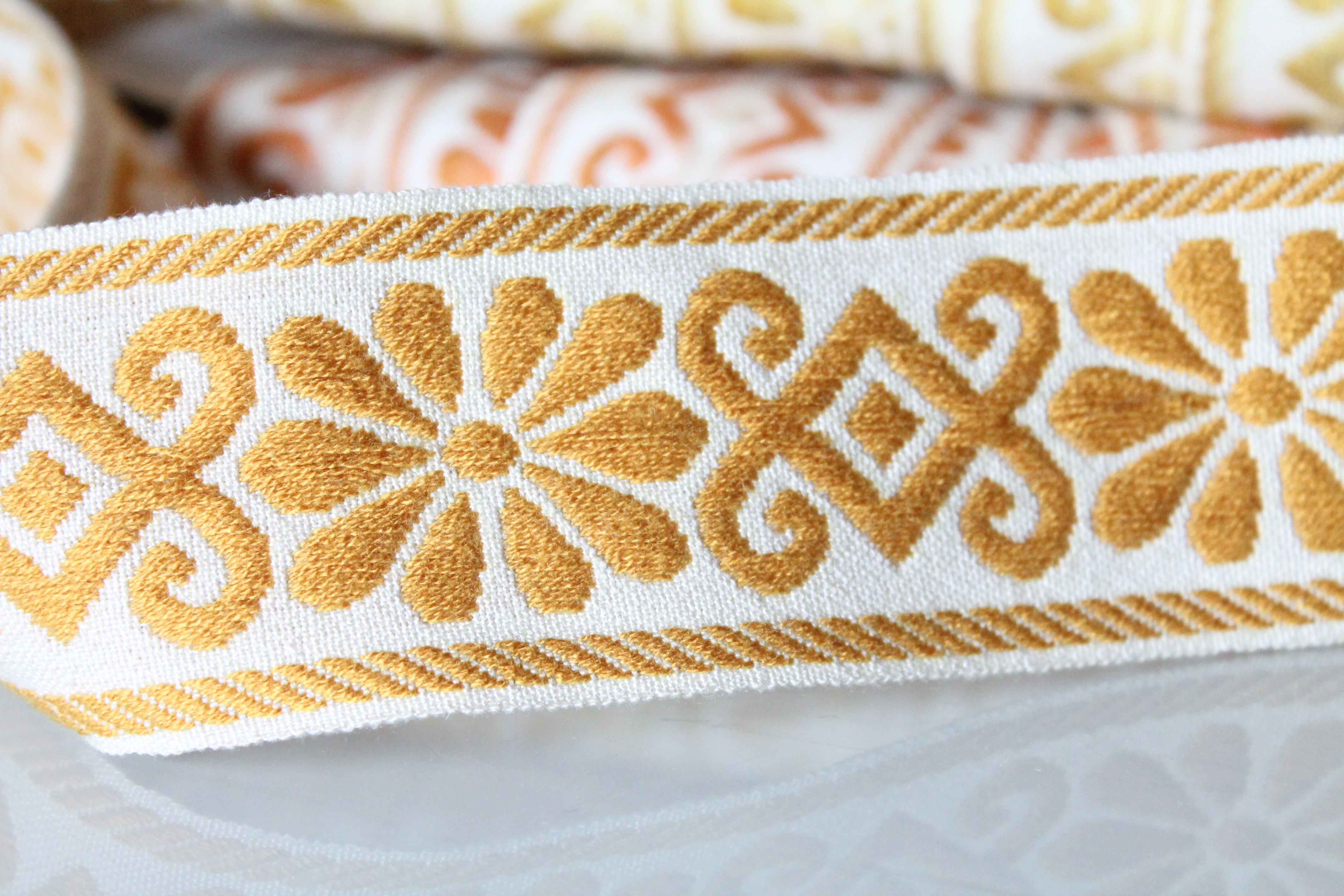 Galon ameublement jacquard à fleurs géométriques de largeur 4.8 cm - 1.89" sur 1 mètre, 100% acrylique Dralon, fabriqué en France,2898