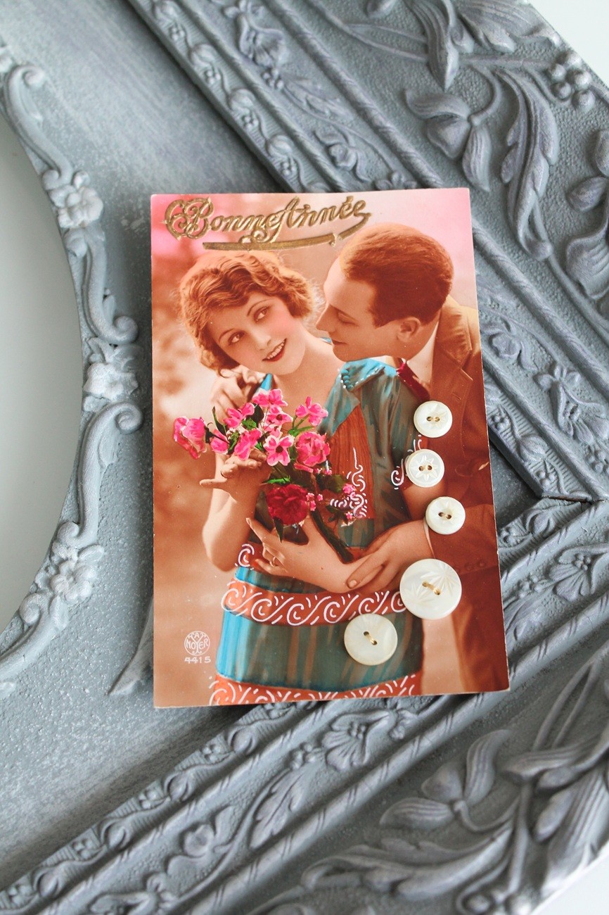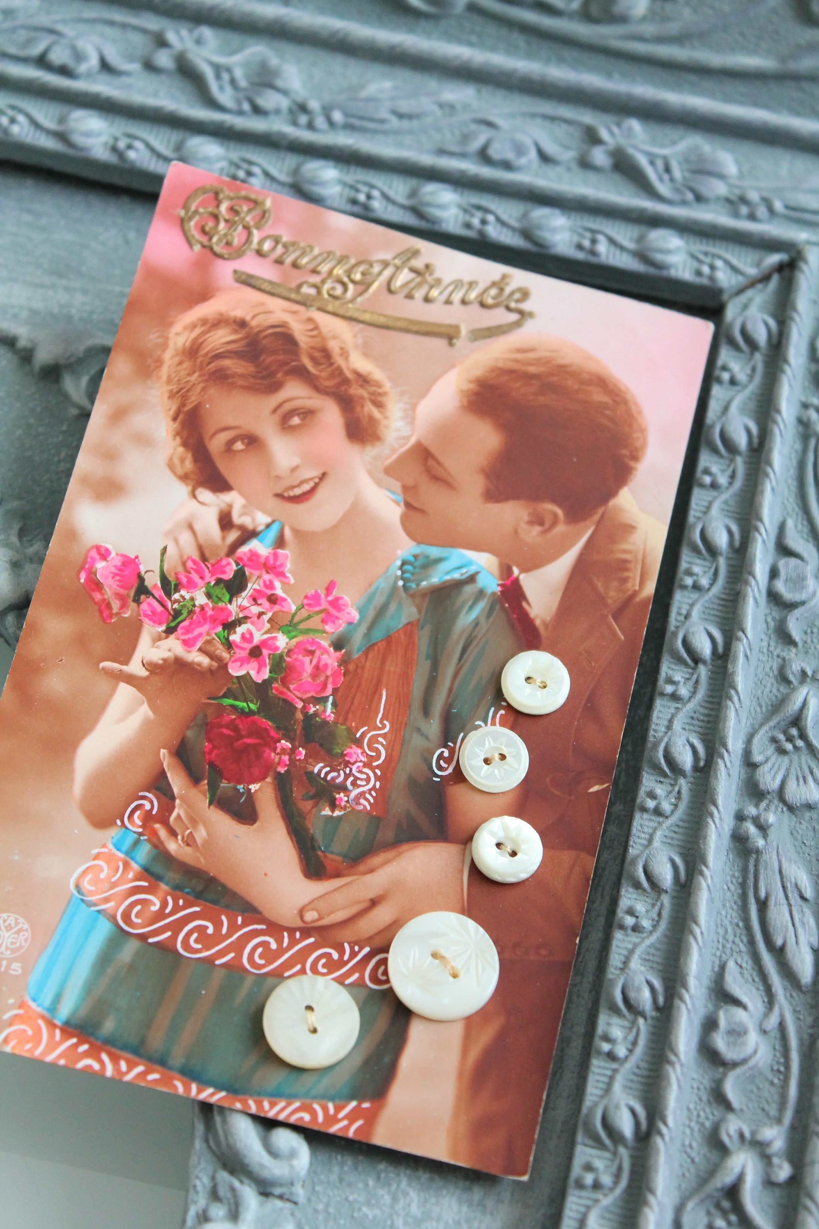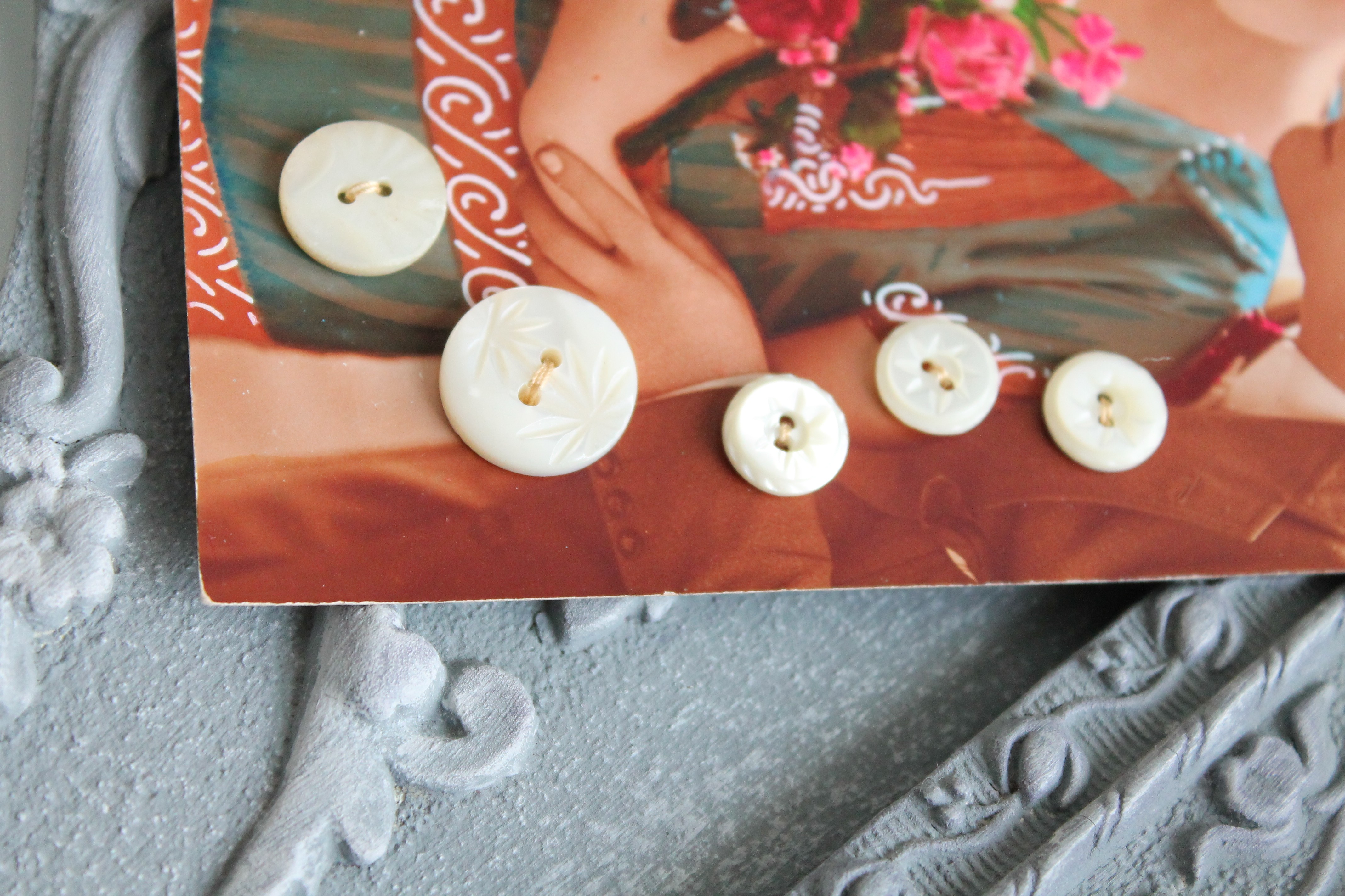 Boutons anciens en nacre ciselée x 5, cousus sur carte postale ancienne, vers 1920, nacre blanche, 403