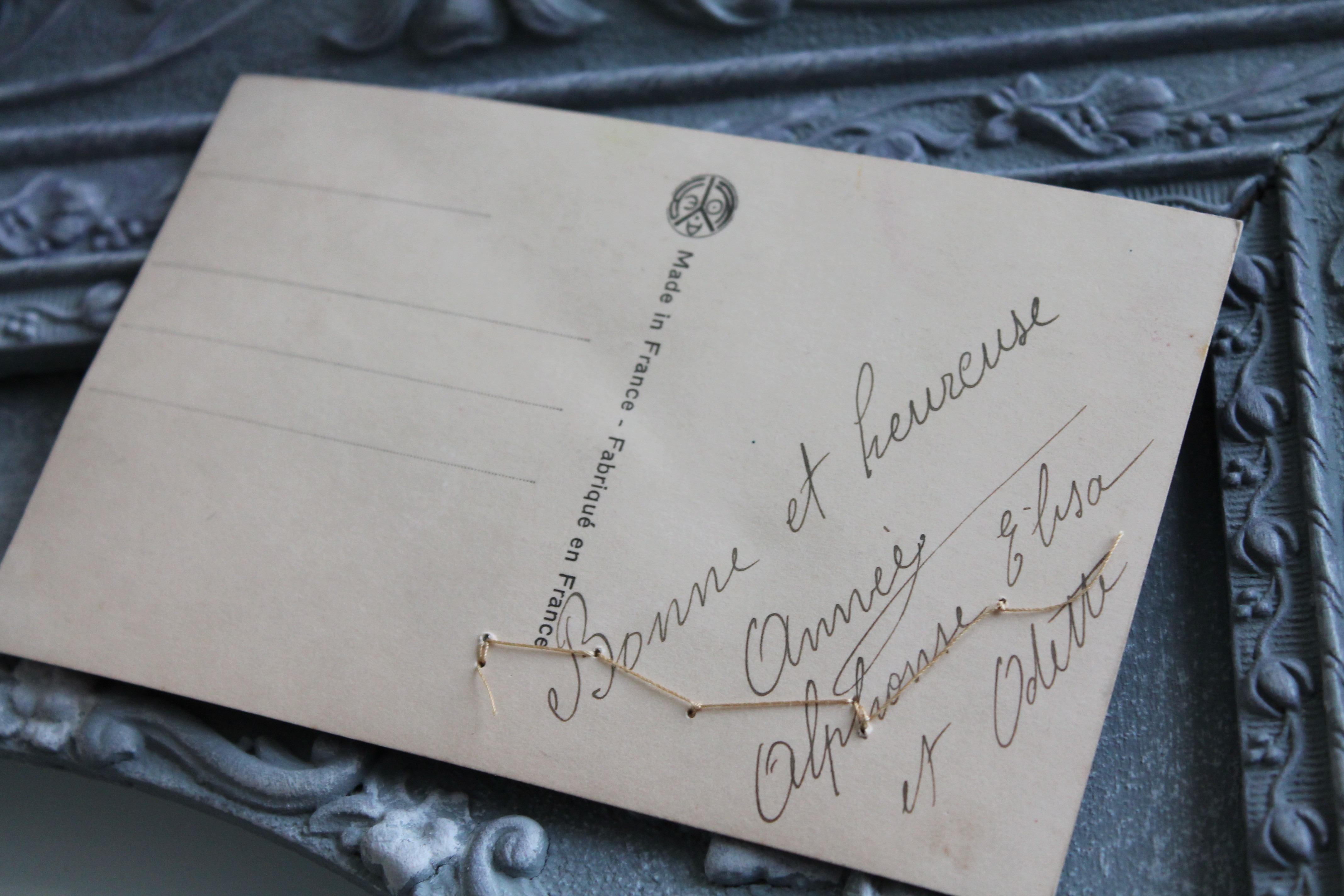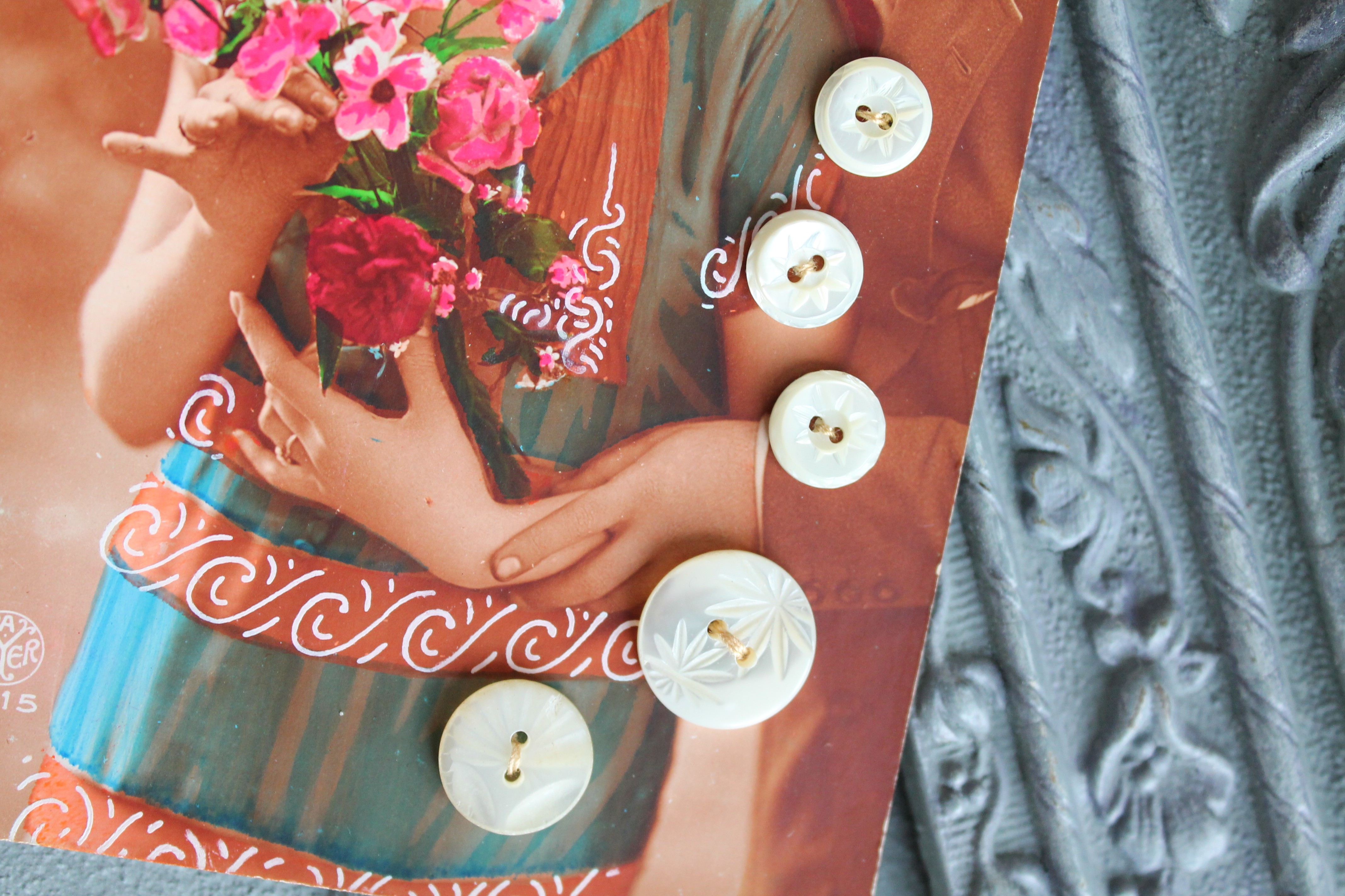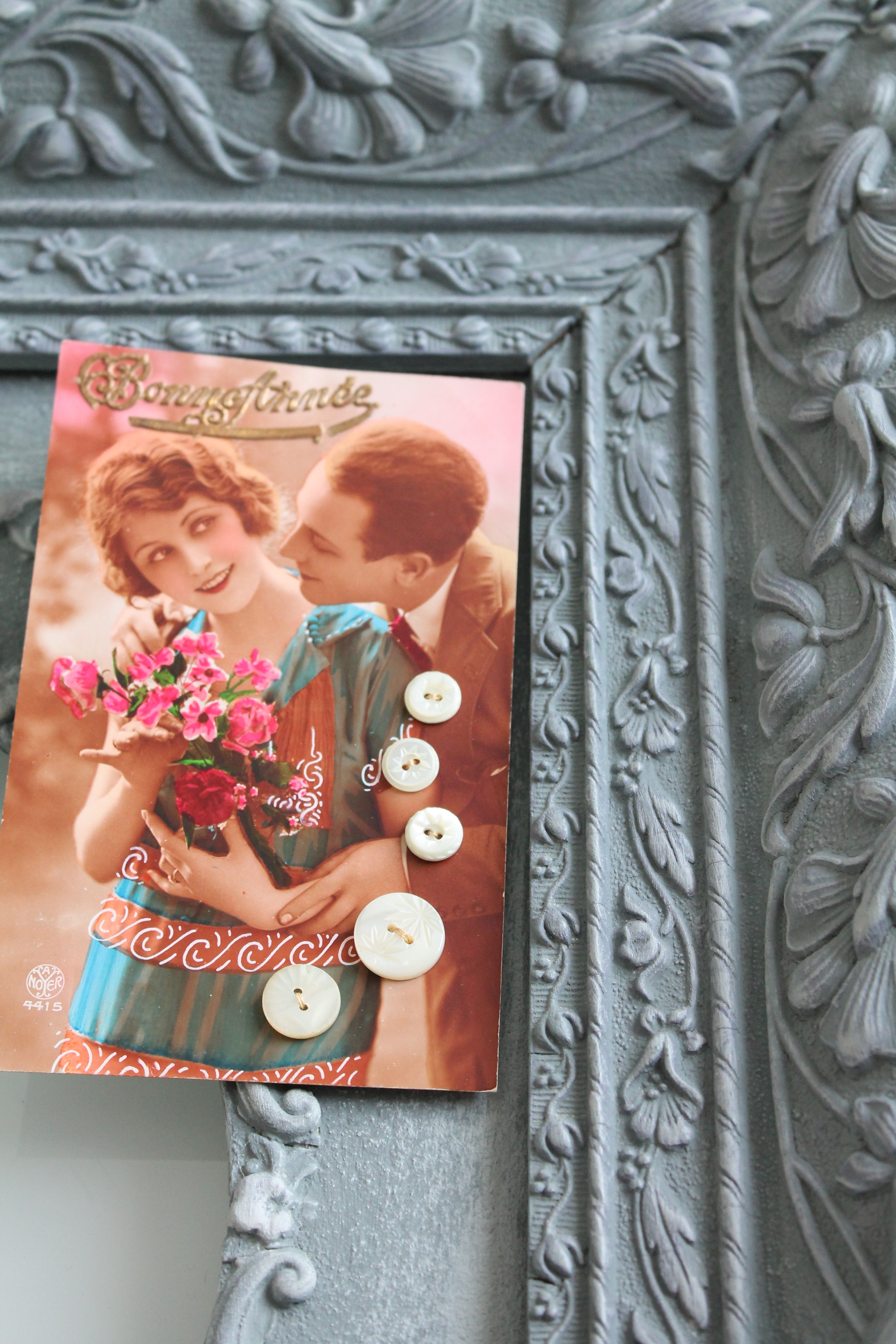 Boutons anciens en nacre ciselée x 5, cousus sur carte postale ancienne, vers 1920, nacre blanche, 403